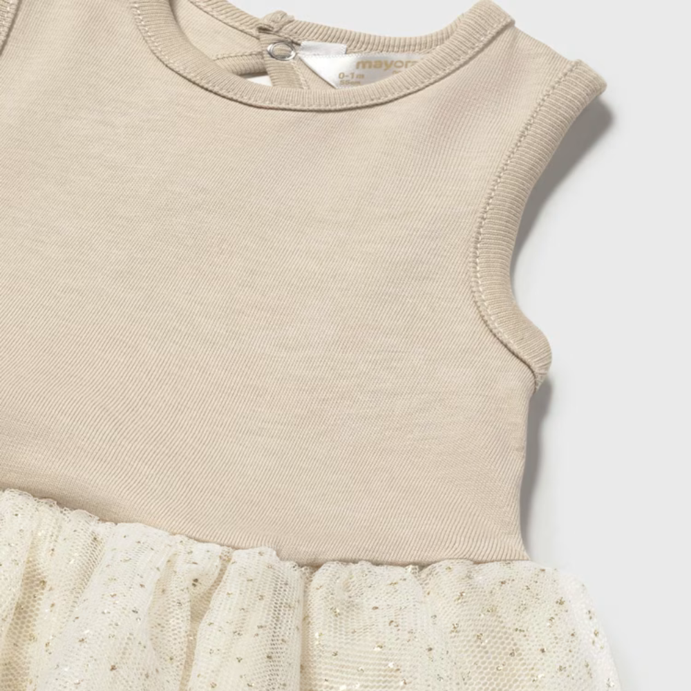 Acest set adorabil de la Mayoral combină un pulover moale cu nasturi cu o rochie ușoară fără bretele cu tul - setul perfect pentru ieșirile în familie și ocaziile speciale.
