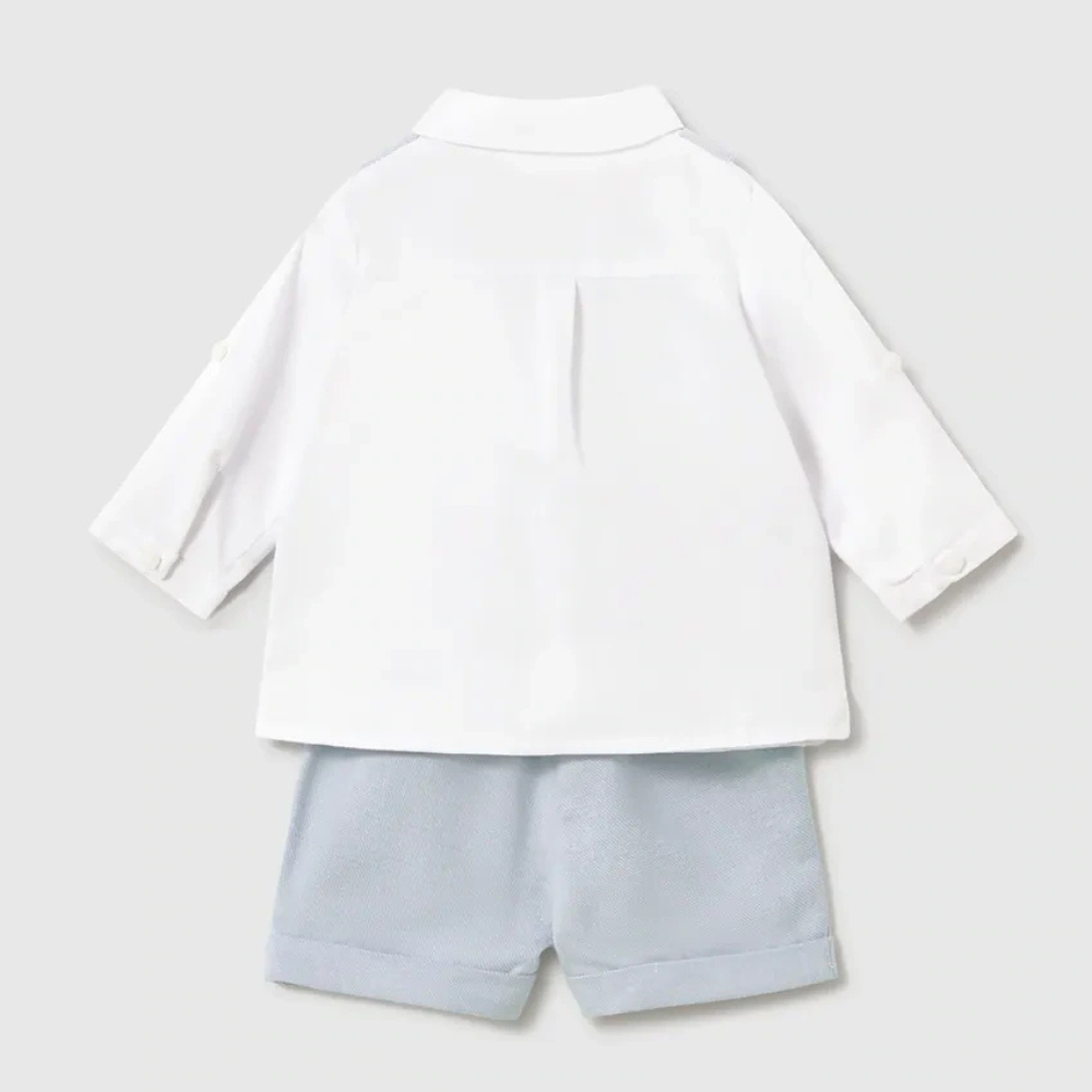 Setul este format din pantaloni scurți, o cămașă albă cu mânecă lungă și o vestă cu un model delicat în carouri, creând un ansamblu coerent și foarte estetic, potrivit încă din primele zile de viață.