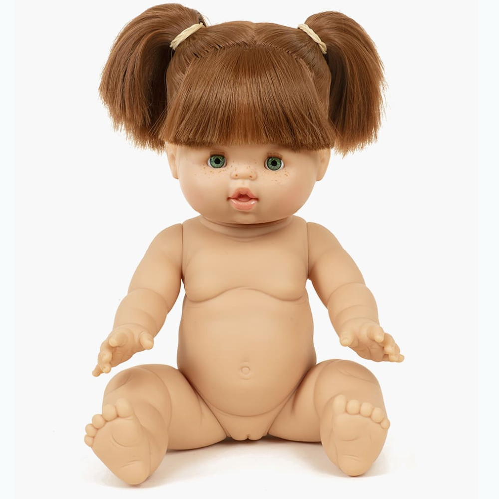 Cu ochi verzi, pistrui pe față și codițe roșii împletite, această păpușă arată ca un adevărat companion pentru poveștile copiilor.