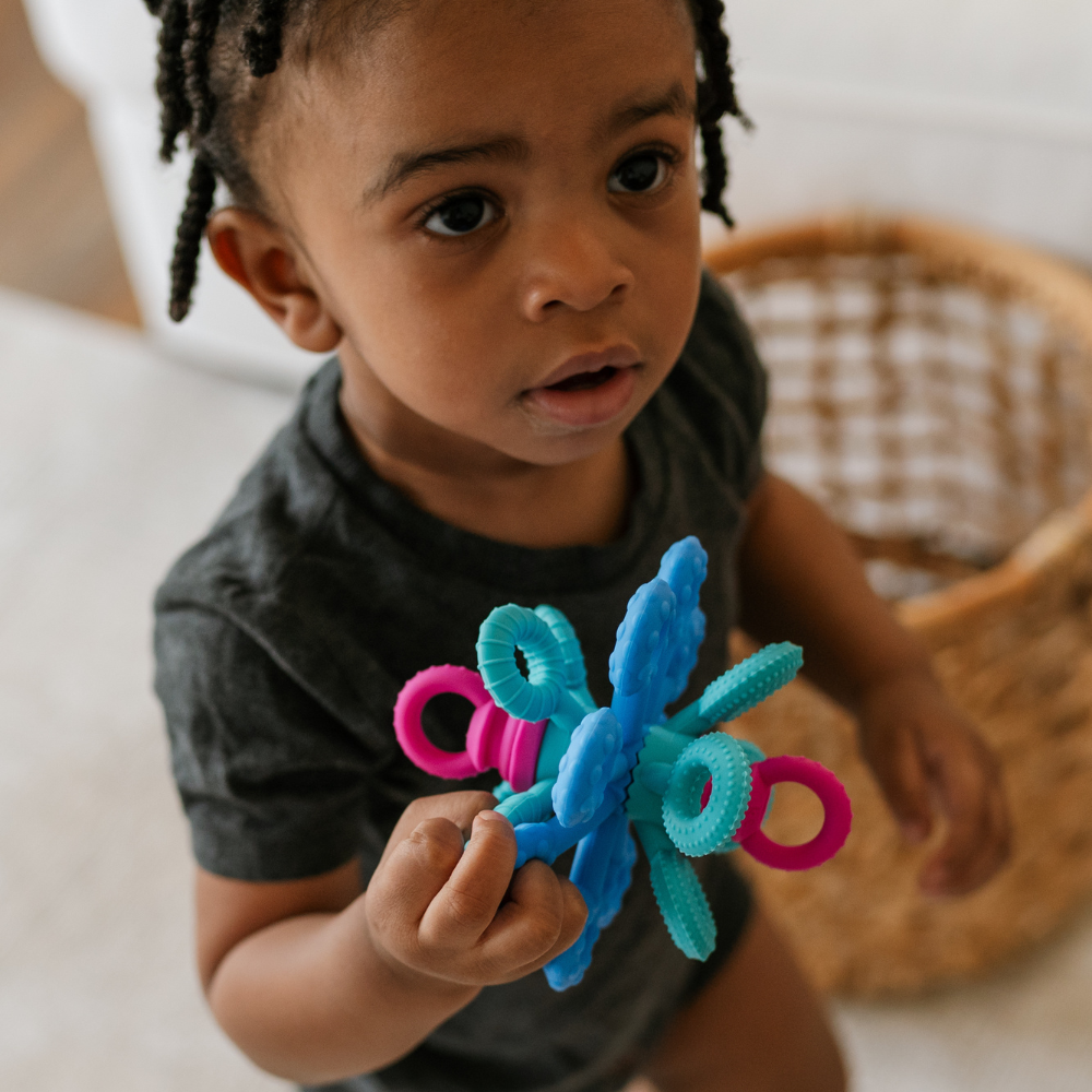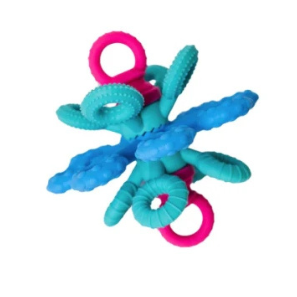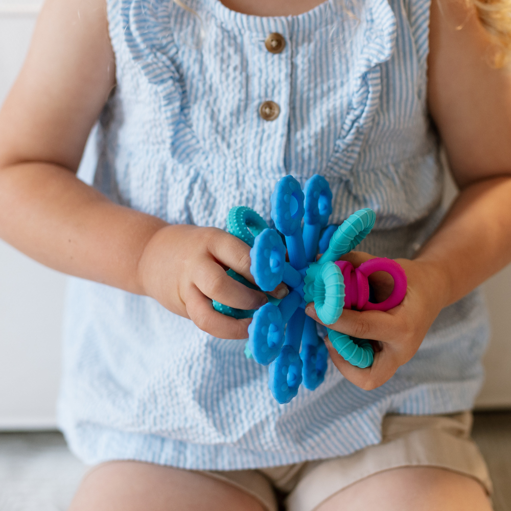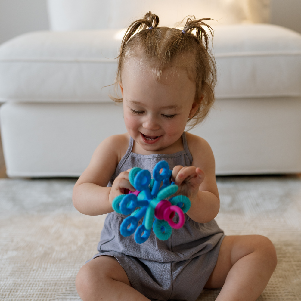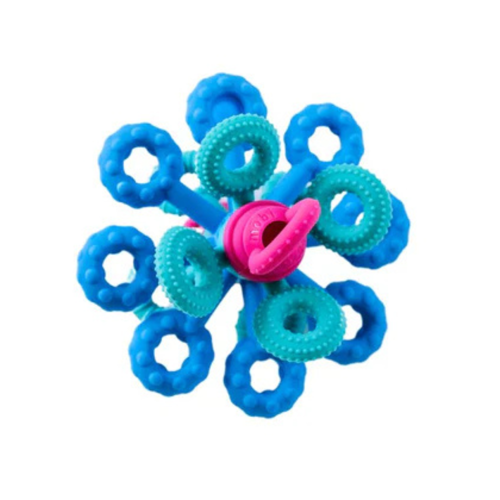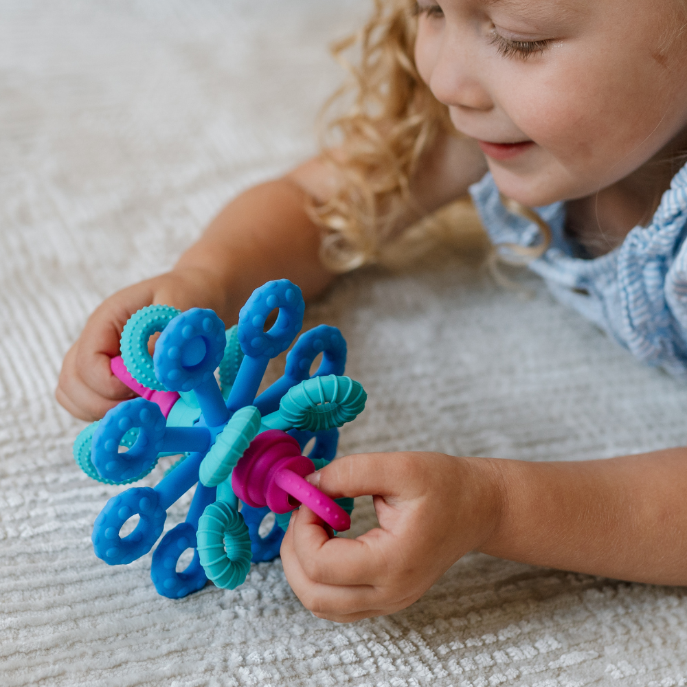 Cele 18 brațe flexibile din silicon încurajează întinderea, strângerea, răsucirea și mușcatul, în timp ce marginile zimțate ale celor trei inele produc vibrații plăcute și blânde atunci când sunt rotite.