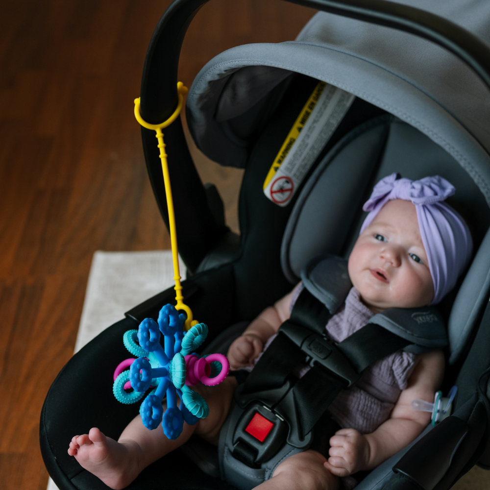 Designul lui Okee a fost dezvoltat cu atenție pentru a crește odată cu copilul dumneavoastră: la început acționează ca un dispozitiv de legare sigur și un stimul tactil, mai târziu exersează precizia degetelor, puterea de prindere și coordonarea ochi-mână, iar în etapele ulterioare poate acționa ca un fidget pentru copiii mai mari.