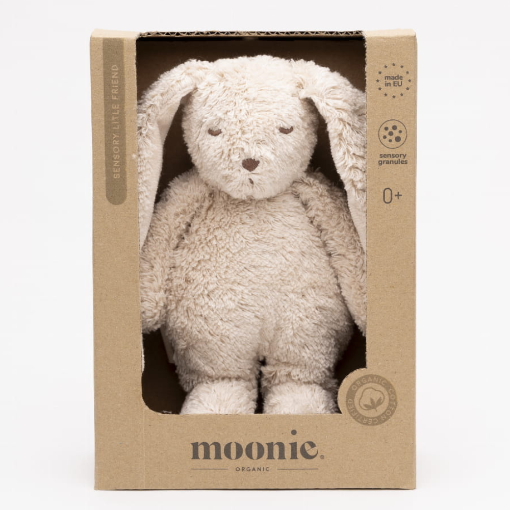 Ursulețul de pluș senzorial Moonie este primul companion perfect pentru bebeluș pentru a sprijini dezvoltarea din prima zi.