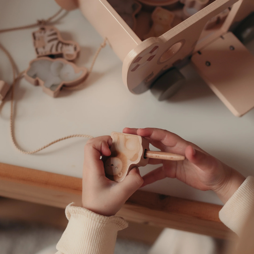 Acesta este setul ideal pentru învățarea prin practică - copilul mic sortează, aranjează, înșiră și rulează, iar barca de lemn pe roți devine baza pentru scene și călătorii fără sfârșit.
