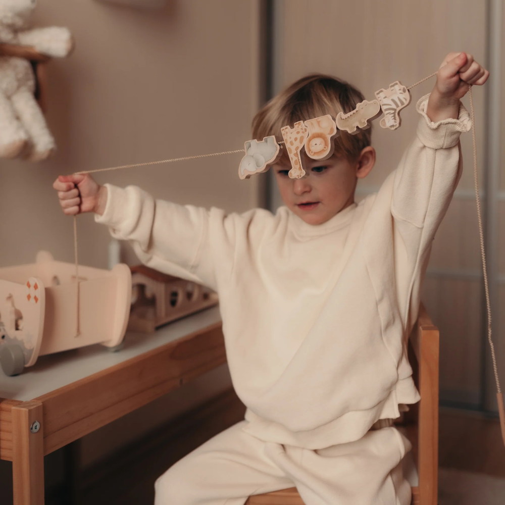 Setul include până la 22 de piese: 14 animale, un curcubeu, o rampă cu scară, o barcă pe roți și o sfoară cu un vârf de lemn prin care se înșiră figurinele.