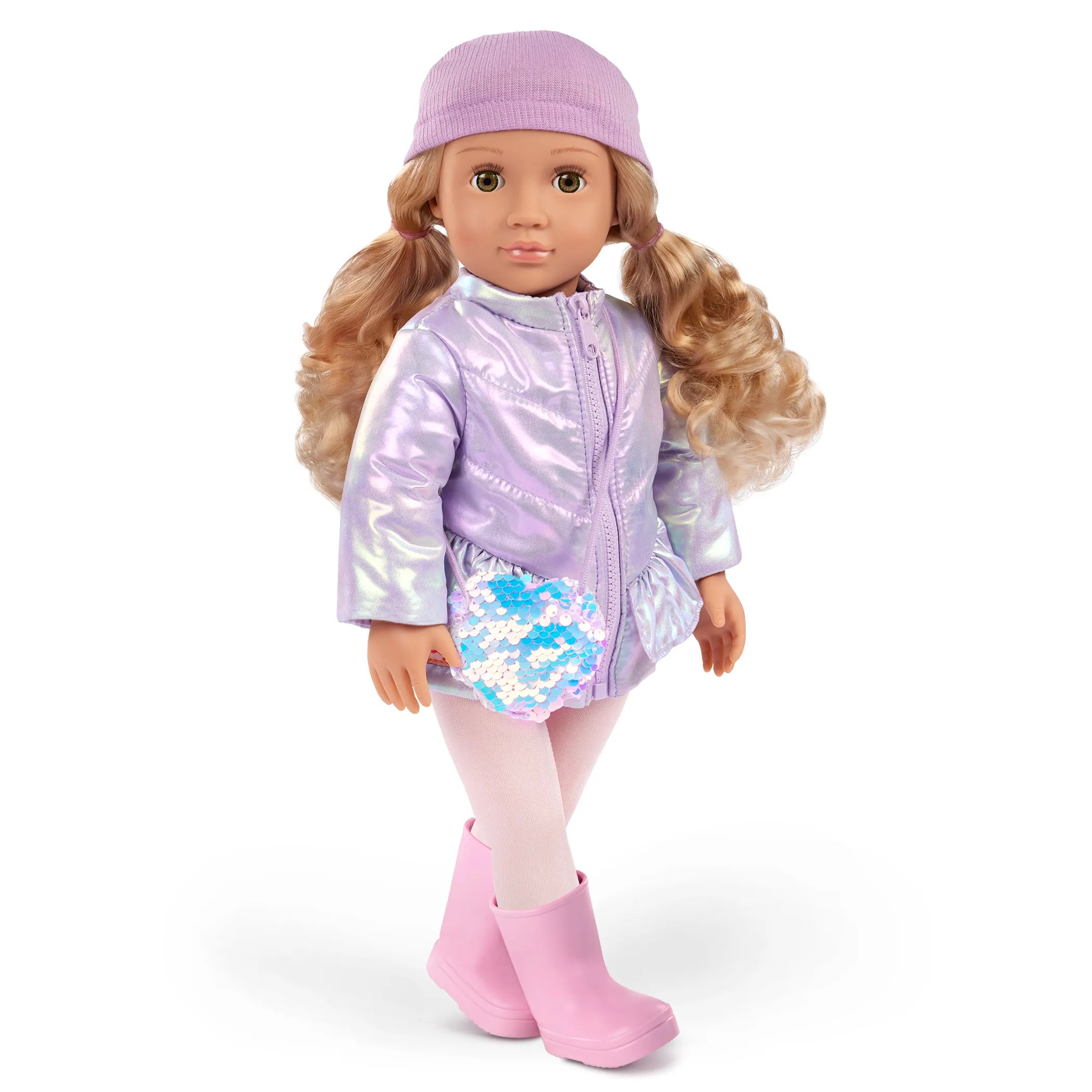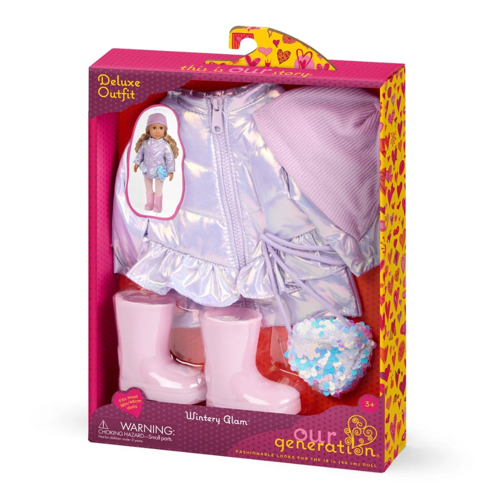 Our Generation Setul de haine pentru păpuși cu jachetă strălucitoare și geantă cu paiete