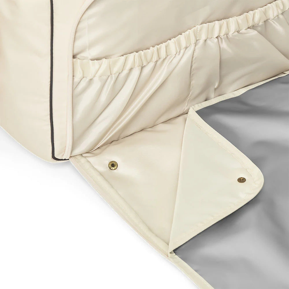 De asemenea, este prevăzută cu un covoraș de schimb, adăpostit într-un buzunar exterior mare care poate fi detașat și îndepărtat cu ușurință, lăsând spațiu suplimentar pentru alte articole. Interiorul genții are compartimente spațioase, inclusiv un buzunar dublu cu căptușeală termică, ideal pentru depozitarea sticlelor de lapte sau a băuturilor.