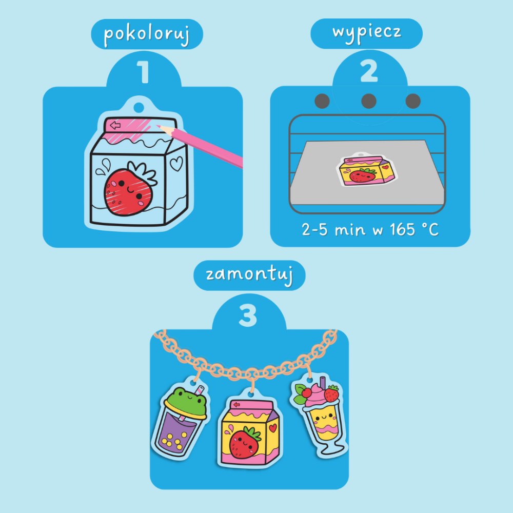- Setul include: 6x elemente decupate din plastic magic, 6x creioane colorate, 1x lanț metalic, 6x conectori pentru pandantive, instrucțiuni ușor de urmat