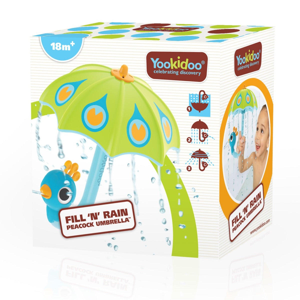 Jucăria de baie Yookidoo sub forma unei adorabile umbrele de păun transformă momentele zilnice de baie într-o experiență plină de distracție și descoperiri.