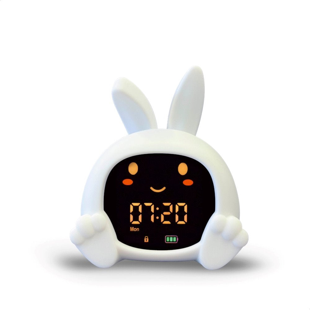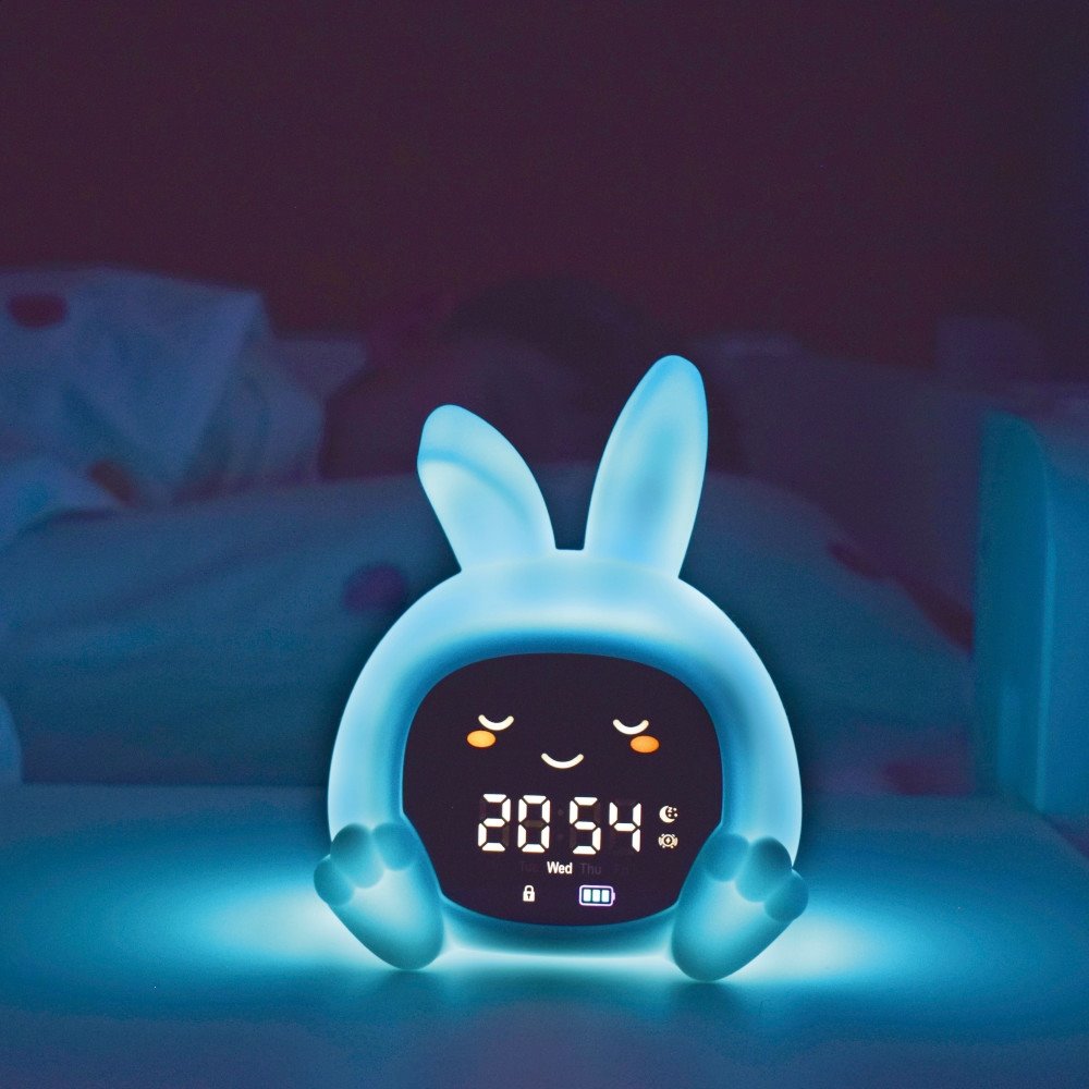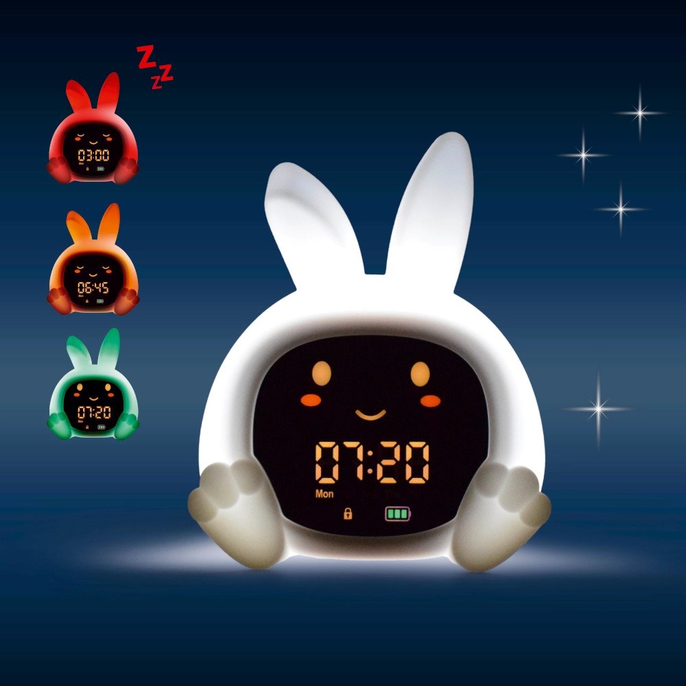 Acesta combină funcția pe care o oferă un antrenor de somn pentru bebeluși cu o lumină de noapte multicoloră, o cutie muzicală și primul ceas cu alarmă.